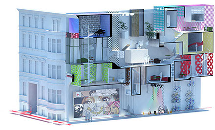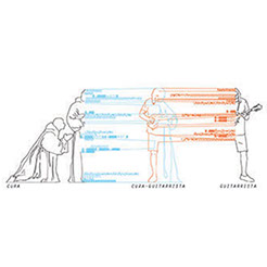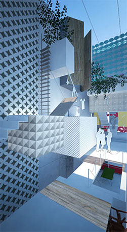 The entrances are at the same level sharing to a negotiated common space. Oblique and horizontals connections, overlaps, interaction on volumes, intersections and approaches are the actions that make possible this space.