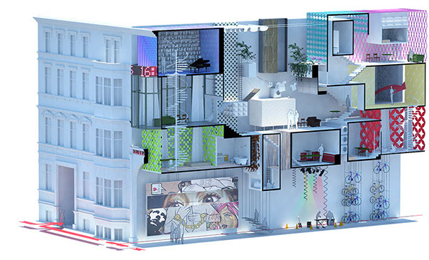 The proposed access is through the adjacent buildings. Existing homes are extended in order to provide an alternative economy to maintain the existing family structure. Immaterial exchange can also happen sharing experiences in between the new inhabitants.