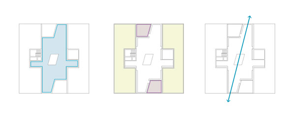Ein durchgehender Luftraum, vom Dach bis ins UG, bestreut diese Gemeinschaftszonen mit Zenitallicht und ermöglicht gleichzeitig eine geschossübergreifende Sichtverbindung.