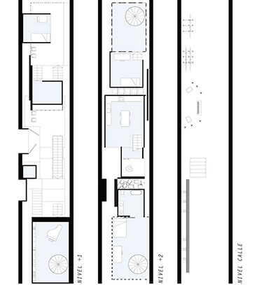 The entrances are at the same level sharing to a negotiated common space. Oblique and horizontals connections, overlaps, interaction on volumes, intersections and approaches are the actions that make possible this space.