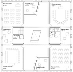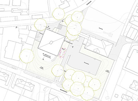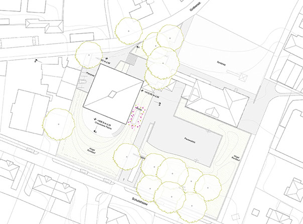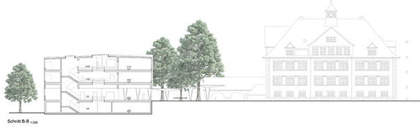 Die Grundrissform des Neubaus wird orthogonal zum Bestand und zu den Nachbargebäuden ausgerichtet, unter Berücksichtigung der zu erhaltenden Bäume und der Integration in die bestehende stätebaulische Komposition. Um die qualitativ hochwertigen Aussenräume der Schulanlage zu prägen, wird ein kompaktes Volumen für den Neubau konzipiert.