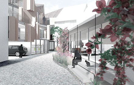 Alle Wohnungen sind in zwei Himmelsrichtungen orientiert und verfügen über Aussenwohnbereiche wie Loggien oder Terrassen. Die Wohngemeinschafts-atmosphäre wird ausserdem durch einen Mehrzweckraum und einen gemütlichen und bepflanzten Aussenbereich im Hinterhof ergänzt.