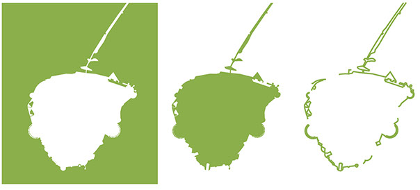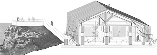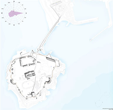 In the intersection between the pathway and the buildings, the path enlarges and melts with the inside spaces of the buildings. This marks the main programmatic points of the project: ornithology, native flora and marine life. The pathway sews the perimetrical fortification in ruins, marking its presence or sometimes disappearing remarking its absence.